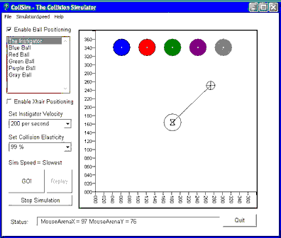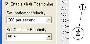 The initial angle of motion of the Instigator is set by moving the crosshair around the arena. To move the crosshair, set the CheckBox labeled "Enable Xhair Positioning". Then, move your mouse pointer to the arena. Note how the crosshair sprite will follow your mouse pointer around the arena. Note also that a rubber band line will always be stretched between the Instigator ball and the crosshair sprite. This line represents the initial direction of motion of the Instigator once the animation commences. To set the location of the crosshair sprite, left-click the mouse.