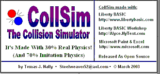 I wrote the Collision Simulator to see if I could make realistic-looking ball collisions using everybody's favorite programming language, [Liberty BASIC]. On my system (1.8gHz, 512MB RAM), I like to set the Simulation Speed to slow or medium, set the Instigator initial velocity to 260 per second or higher, and set the Collision Elasticity to 96% or lower. These settings give me pretty good results. Because computer systems vary so widely, experiment with the settings to get the results that you like. (On my 266mHz computer, I set the Simulation Speed to Fastest.) When you see a simulation that you like, press the "Replay" button to see it again before you go on to the next simulation.