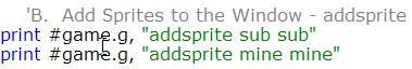 Now referring to Figure 4, the addsprite command takes sprites that you have loaded into memory and places them on the designated graphicbox or graphic window. Notice that it seems like we have given the name of the loaded bitmap twice for each sprite we are adding. Actually we are cloning the loaded bitmap. The first name is the name we are giving the clone and the second name is the name of the bitmap we are cloning. This is useful if we wanted 10 subs in our game that looked like "goodsub" then we would only load "goodsub" once with loadbmp but add it 10 times to the window 10 times with addsprite. We would then addsprte sub1 sub; addsprite sub2 sub; addsprite sub3 sub; ...etc. We would have 10 subs that looked alike but they would all have different names allowing us to manipulate each differently.