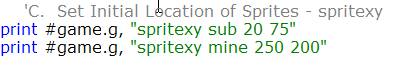 In Figure 5 we are setting the X and Y locations of our sprites We use the spritexy command for this. We give the clone name and then the X and Y coordinates of the sprite. In case you are wondering the upper left corner of our graphicbox is X0 Y0. Anywhere to the right of the corner or down from the corner is a positive number. X is the horizontal (horizon) axis and Y is the vertical (up and down) axis. X is always first and Y second just like in the alphabet (hope you don't have to sing the whole alphabet song to figure that out).