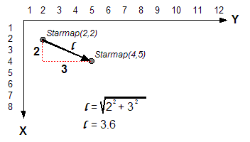 In this image we are moving a vertical distance of 2 and a horizontal distance of 3. The actual distance calculated (using simple geometry) is about 3.6 units. We would multiply that times 1.25 to make a total movement of 4.5 units, requiring 450 gigajoules to make the jump.