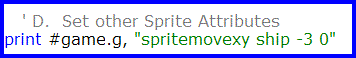 Referring to Figure 3, we need to give the "automove" command for the sprite, which is the spritemovexy command. With the spritemovexy command we simply need the name of the sprite and how many pixels we want the sprite to move each time the window is redrawn. Remember, X is first and horizontal and Y is second and vertical. +X moves to the right and –X moves to the left. +Y is moves down and -Y moves up. So, with the -3 we are moving the ship 3 pixels to the left each drawsprites and with the 0 we are not moving the ship up or down, it stays at its current Y position. Add the line from Figure 3 to your code.
