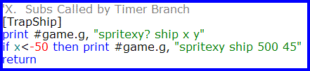 Add the above branch and code. We have a new command here, spritexy?. This command get's the coordinates for ship and places them in the variables x and y. In the next line we check to see if ship has gone off the left edge by comparing it's x with what we feel is far enough to the left, in this case -50. Once the "if" part of the expression is true the "then" part comes into play and simply places the ship back at the start location. You may ask how I got -50. Well I simply guessed at what I thought would give the impression of the ship going completely off the edge and worked from there. If you know the exact width of your sprite you could simply have subtracted that number from zero and gotten it exactly.