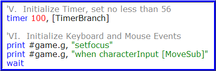 Above we have moved the wait from under the timer routine to the end of the Mouse and Keyboard events area. If we did not do this then the program would never look for the keyboard or mouse inputs and they would do nothing in our program. To learn more about the setfocus, command refer to the Helpfile under Command Reference and then look at "setfocus". The characterInput command simply says that if there is any keyboard input go to the [MoveSub] branch.
