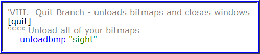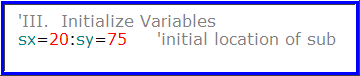 In case you didn't notice, (I didn't until I had a student to work through this session) when you press one of the keys that control the sub, the sub jumps up to the upper left hand corner of the limits we set when trapping the sub. What has happened here is that we are using variables for the sub location that we have not previously declared (see Figure 6). So, LB declares them here and gives them a value of zero when we actually need the values of the subs initial location. So the program, when we first press a key, tries to place the sub at 0 0. We will get more into declaring variables next session but let's go ahead and fix this one. First, under "III. Initialize Variables" type in the code from Figure 8b, this is called declaring our variables.