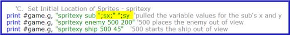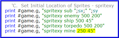 Next we need to use the declared variable in initial location of the sub. Under Section C of your game outline change the initial location values of the sub to those highlighted below in Figure 8c. This will now cause the values associated with the variables to be used for the sub's initial x and y value. There is a space between sub and the quotation mark.