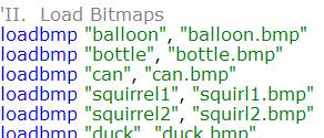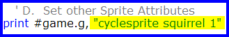 We have a new command in Figure 17, cyclesprite. This causes LB to cycle through the bitmap images that we designated when we added squirrel to the graphic box. The number 1 simple tells LB to cycle through the images in the order they were listed. A -1 would have caused it to cycle through the image set in reverse order.