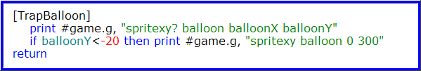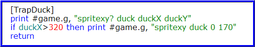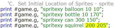 You may wonder if there is an easier way to determine at what point you need to trap a sprite. For the above I commented out the nomainwin command with an apostrophe and put two print commands as seen in Figure 6. This printed my sx and sy values to the main window.