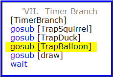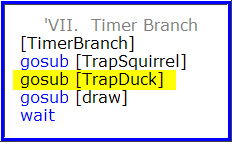 We want to check the location of the squirrel each time a drawsprites command is issued. So, we place a gosub in the TimerBranch that goes to the code we will write that traps the squirrel. Remember that by trapping we are simply stopping the squirrel at specific point and then placing him in a new location. Add the code from Figure 19 under your TimerBranch section.