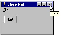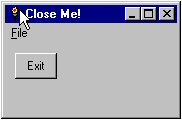nomainwin menu #1, "&File","E&xit",[quit] button #1, "Exit",[quit],UL,10,10 Open "Close Me!" for window as #1 wait [quit] close #1 :end