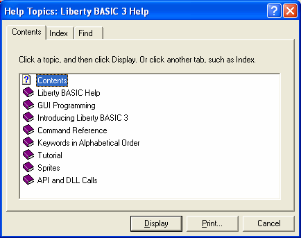 When you need help with your Liberty BASIC programming, the first place to go is the Liberty BASIC helpfile. The helpfile actually consists of two files - Liberty3.hlp and Liberty3.cnt. The main file is Liberty3.hlp. The Liberty3.cnt file is a listing of the contents in the helpfile. It enables the "contents" feature of the helpfile to be used. See CONTENTS below for more on this feature. If you lose the Liberty3.cnt file, the helpfile will still be accessible, but it won't be as easy to navigate. If you corrupt the Liberty3.cnt file, it may be difficult to use the helpfile, so do not attempt to edit this file!