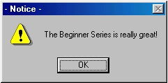 The first one we will use is the NOTICE dialog box. This is what we call a Windows widget. It is a prepackaged Windows tool we call. It will show a basic Windows style dialog box with the message we pass it. Here is the syntax for the command from the Liberty Basic Help file: