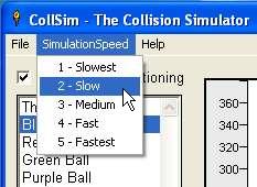 In the slowest simulation speed, CollSim will calculate a total of 6000 different ball positions for each ball, and will calculate them at the rate of 100 per time unit. In the fastest simulation speed, CollSim will calculate only 2000 ball positions, and will calculate them at the rate of only 20 per time unit. In the latter case, because the program updates the ball positions less frequently, it can render a faster animation.