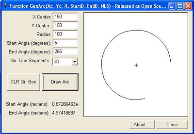 As seen below, the function itself is called GenArc(). But included in the zip archive of this newsletter is more complete BASIC program called GenArc01.bas which provides a simple GUI to allow the user to test out the function by adjusting the input one value at a time.