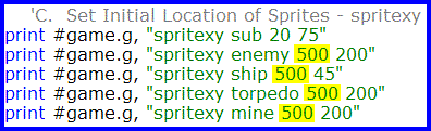 Next we need to use the declared variable in initial location of the sub. Under Section C of your game outline change the initial location values of the sub to those highlighted below in Figure 8c. This will now cause the values associated with the variables to be used for the sub's initial x and y value. There is a space between sub and the quotation mark.