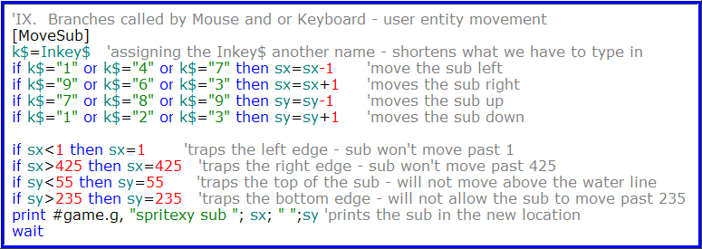 Add the code from Figure 5 to Section IX of your game outline. The [MoveSub] branch actually does the work of moving the sub. First of all we begin by assigning another variable name to Inkey$, just to make things shorter. Then we go around the number pad grouping the number keys based on location. Since 1,4 and 7 are on the left side we set them to move the sub minus 1 pixel each time any of those keys are pressed. sx is a variable name that I have designated to stand for the Sub's X and sy is a variable that I have designated to represent the Sub's Y. Designating variables for the X and Y locations helps to keep the X and Y locations of different entities from getting confused. We then went around and did the same for the other numbers. Notice that 1, 3, 7 and 9 are each listed in two of the statements. This will cause the Sub to move diagonally when one of these keys are pressed. Save you work after these changes and then try it out. Change the trapping numbers and see what happens.