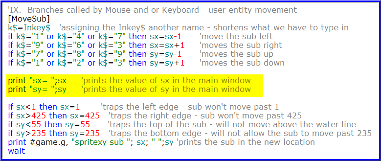 I then brought the game window and main window back up to the top and moved the Sub to the lower right hand location and got the values for the other two lines of code that keep the sub from going off the bottom and right of the viewing area. After you have set up your trapping code in this manner un-comment your nomainwin command and delete the two extra print commands that are highlighted in Figure 6.