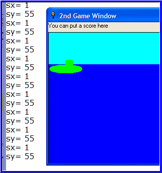 I then ran the program and moved the Sub to the upper left hand location that I wanted it to stop at. I then moved the game window and took the values from the mainwindow and used those values in the trapping code. In Figure 7 you can see where I got my top sy and left sx. I simply moved my sub to that location and used the 1 value for sx and the 55 value for sy.
