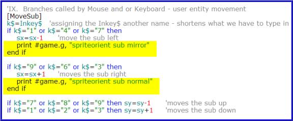 One last item of business with our Sub sprite, to add a little more realism we need for the sprite to change orientation when it changes direction, in other words when it goes right we want it to point right, when it goes left we want it to point left. The spriteorient command is the command we will use to do this; for a more detailed look at this command look in the Helpfile contents under Sprites>>Sprite Properties. Add the following code in your SubCom2 game: