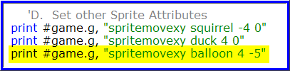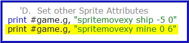 Referring to Figure 3, we need to give the "automove" command for the sprite, which is the spritemovexy command. With the spritemovexy command we simply need the name of the sprite and how many pixels we want the sprite to move each time the window is redrawn. Remember, X is first and horizontal and Y is second and vertical. +X moves to the right and –X moves to the left. +Y is moves down and -Y moves up. So, with the -3 we are moving the ship 3 pixels to the left each drawsprites and with the 0 we are not moving the ship up or down, it stays at its current Y position. Add the line from Figure 3 to your code.