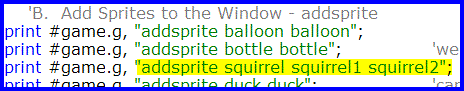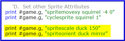 We have a new command in Figure 17, cyclesprite. This causes LB to cycle through the bitmap images that we designated when we added squirrel to the graphic box. The number 1 simple tells LB to cycle through the images in the order they were listed. A -1 would have caused it to cycle through the image set in reverse order.