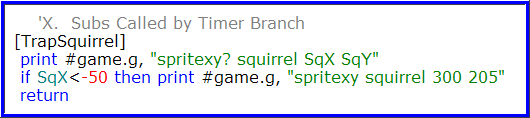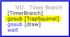 We want to check the location of the squirrel each time a drawsprites command is issued. So, we place a gosub in the TimerBranch that goes to the code we will write that traps the squirrel. Remember that by trapping we are simply stopping the squirrel at specific point and then placing him in a new location. Add the code from Figure 19 under your TimerBranch section.