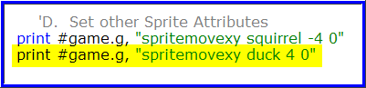 Now we want the duck to move from left to right. The duck is starting out at X0 and moving toward X300. To go from 0 to 300 in steps of 4 pixels we would add, so our X value for our spritemovexy command is a positive 4. We want the duck to move straight across so our Y value will remain 0