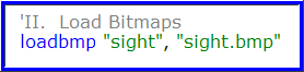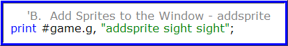A sighting ring gives things a "high-tech" feel. So, let's add one. First we must go through the process of adding a new bitmap and sprite to our game. You are familiar with all of this so I'm giving you the code only. These bits of code should be added in their respective sections on the outline (which I have included) after the code of their kind.
