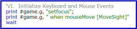 Add the code from Figure 34 to Section VI of your code. In Figure 34 we have moved the wait from under the timer routine to the end of the Mouse and Keyboard events area. If we did not do this then the program would never look for the keyboard or mouse inputs and they would do nothing in our program. To learn more about the setfocus, command refer to the Helpfile under Command Reference and then look at "setfocus". The mouseMove command simply says that if there is any mouse movement go to the [MoveSight] branch.