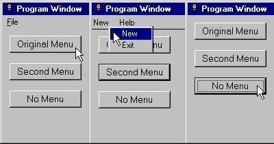If it is advantageous to have different menubars at different points in a program, some API calls are necessary. The window handle is used in an API call to get the handle of the window's menu. (The following API call wrappers are from LB Workshop.)