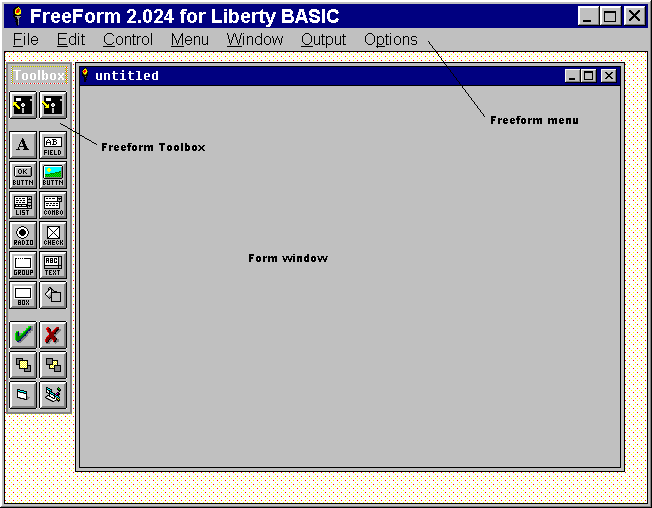 Freeform is the free GUI developer distributed with Liberty BASIC. With Freeform, one can easily manipulate the appearance of windows and the controls on the windows, then automatically generate code to paste into a Liberty BASIC application.